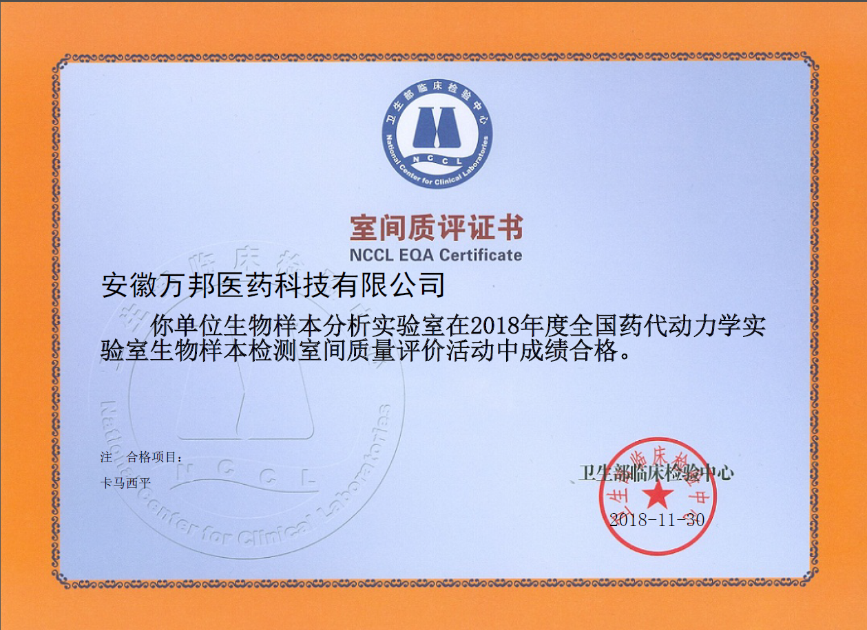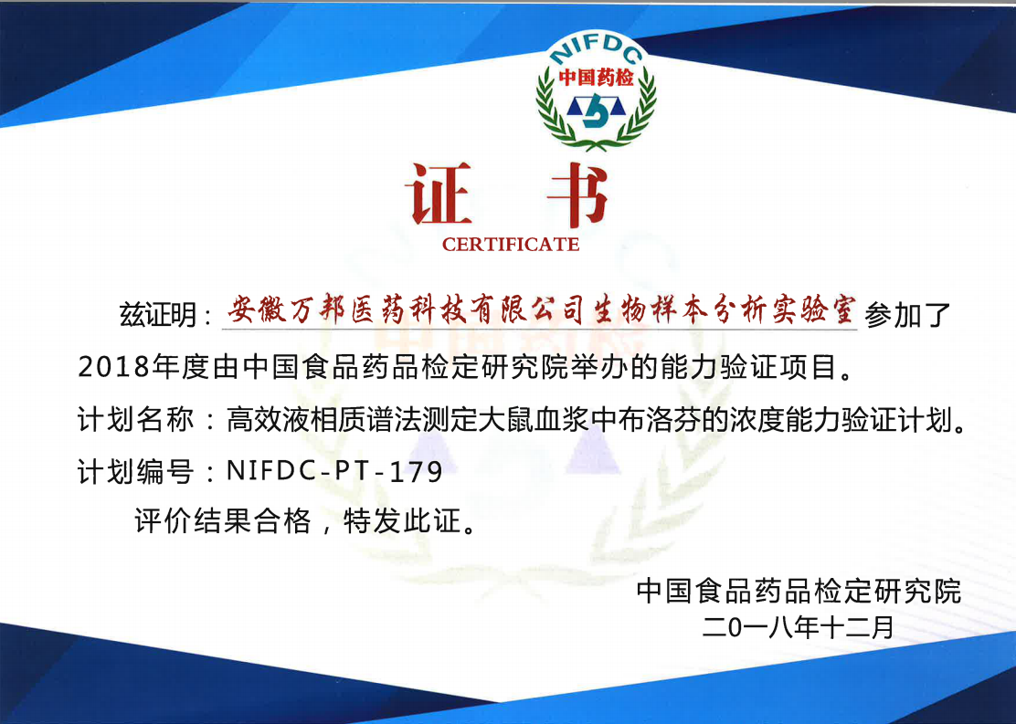 2018年12月安徽萬邦醫(yī)藥科技有限公司生物樣本分析實驗室順利通過衛(wèi)生部臨床檢驗中心的室間質(zhì)評,同時“高效液相質(zhì)譜法測定大鼠血漿中布洛芬的濃度能力驗證計劃”通過中國食品藥品檢定研究院舉辦的能力驗證。