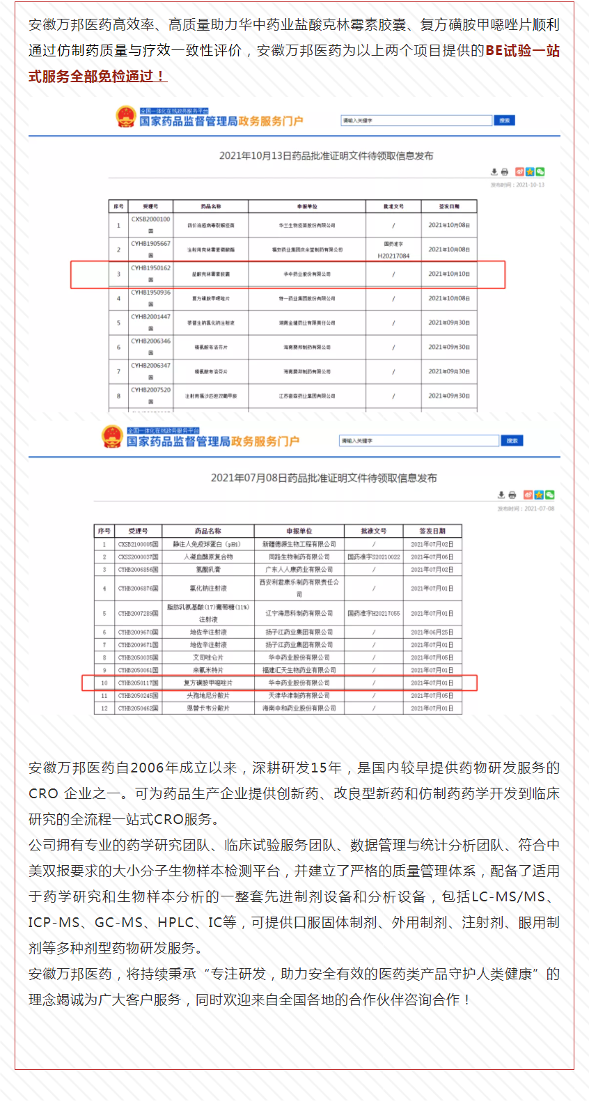 喜報|安徽萬邦醫(yī)藥助力鹽酸克林霉素膠囊、復(fù)方磺胺甲噁唑片順利通過一致性評價