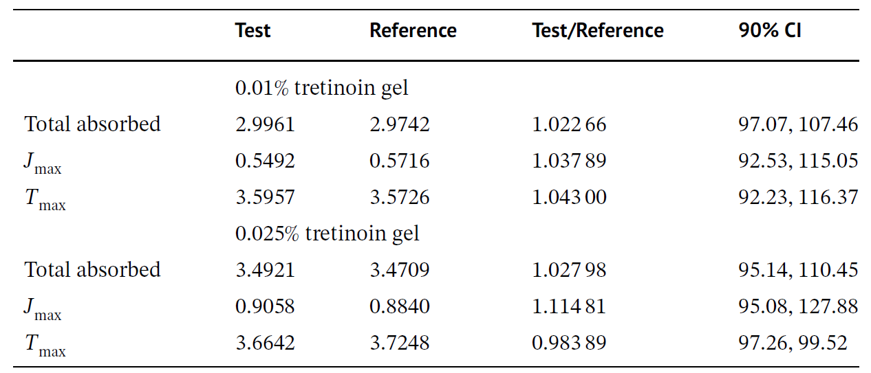 維A酸產(chǎn)品在此之前進行一項類似模擬BE的IVPT研究,即對足夠數(shù)量的皮膚樣本進行測試,并按照計算FDA建議的置信區(qū)間進行統(tǒng)計。根據(jù)IVPT研究結(jié)果,兩種維A酸仿制藥(0.01%凝膠,0.025%凝膠)與相同規(guī)格的參比制劑(Retin-A)具有生物等效性,對于0.01%維A酸凝膠的所有三個主要終點和0.025%維A酸凝膠的三個主要終點中的兩個主要終點,都達到了90%置信區(qū)間在(80-125%)的要求。第三個終點(Jmax)略高于體外BE限值(95.1-127.9%)。
