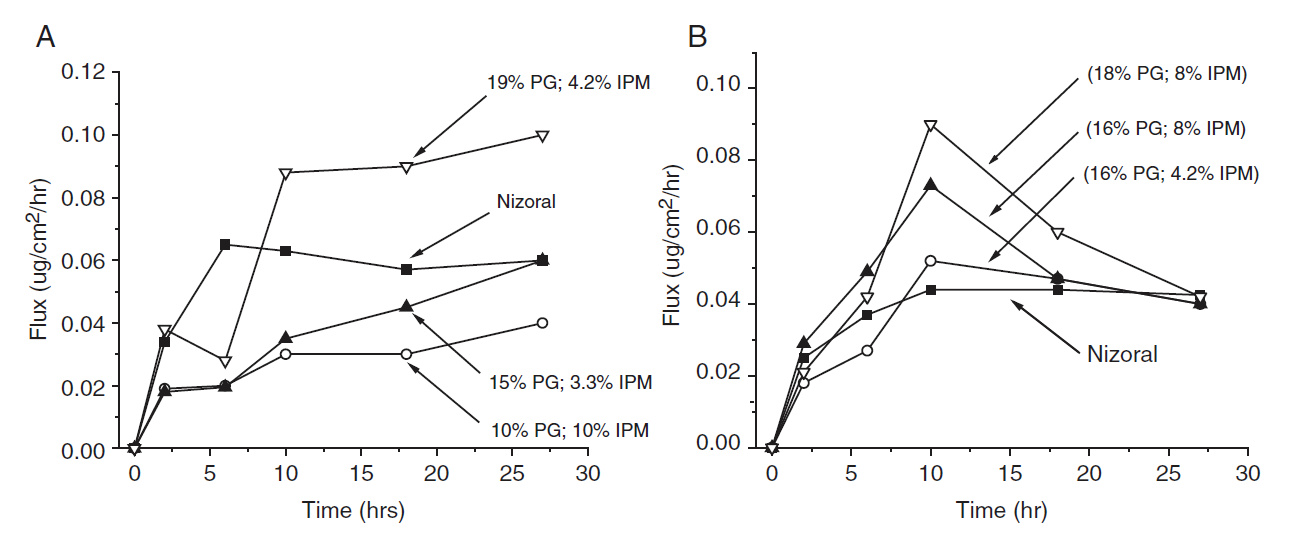 圖1.比較不同濃度丙二醇(PG)和肉豆酸異丙酯(IPM)酮康唑原型制劑的體外吸收速率,以確定哪一種制劑與參比制劑(Nizoral)最匹配。(A)測試的前三種受試制劑均與參比制劑不匹配。(B)第二組三個受試制劑中的一個方與參比制劑非常接近。