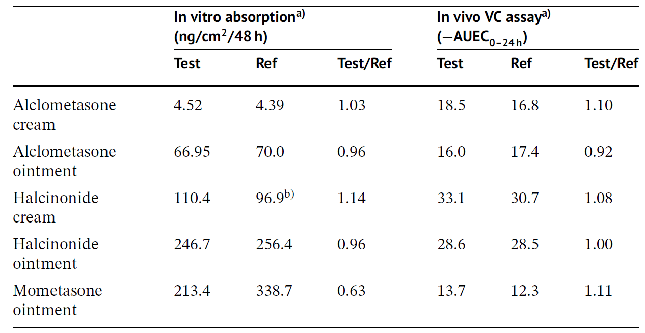 5種糖皮質(zhì)激素制劑中的4種的體外IVPT數(shù)據(jù)也與FDA批準的臨床研究數(shù)據(jù)一致(人體VC試驗),受試/參比的比例從0.96~1.14(表2)。