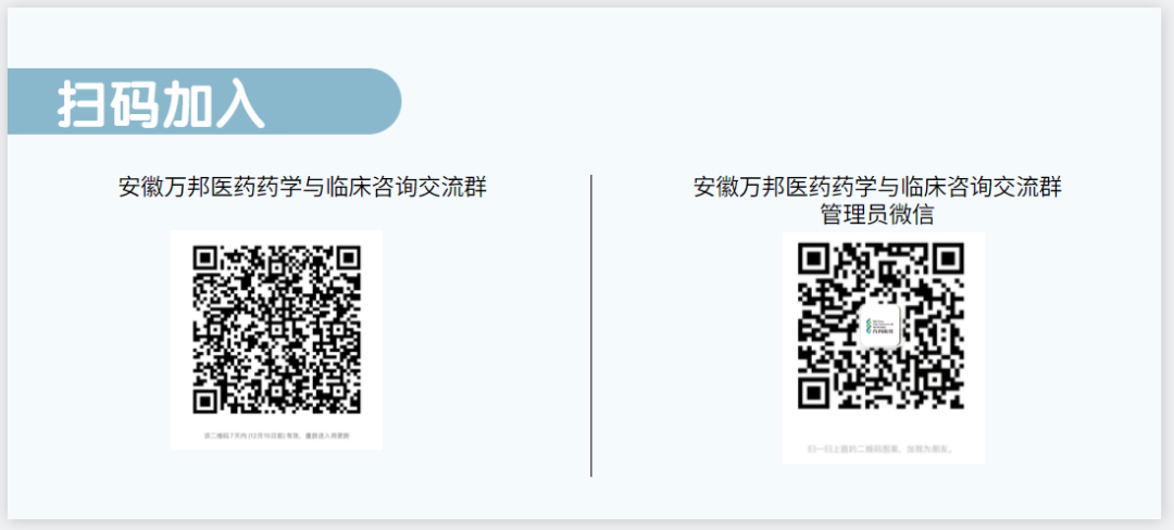 歡迎廣大客戶加入安徽萬邦醫(yī)藥藥學(xué)與臨床咨詢交流群,群內(nèi)可與專業(yè)老師交流互動。若群二維碼過期,請?zhí)砑尤汗芾韱T微信通過邀請方式進(jìn)群!