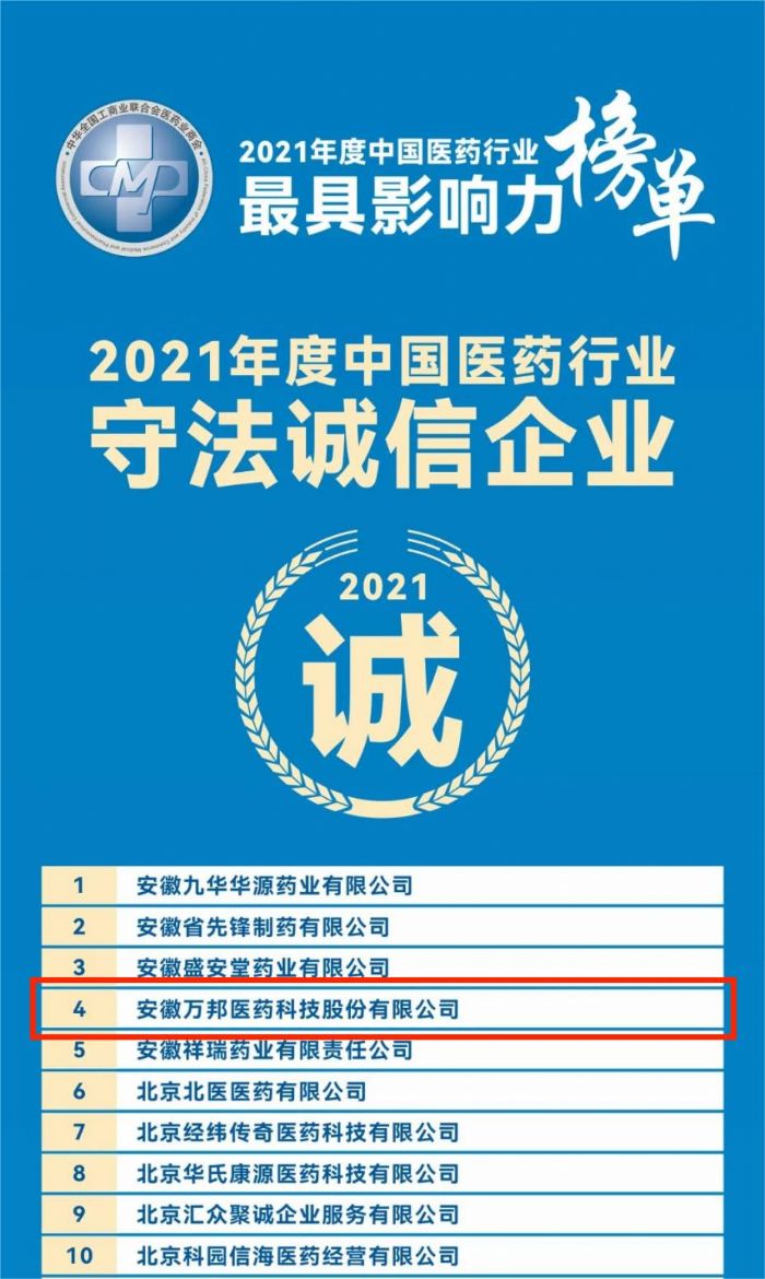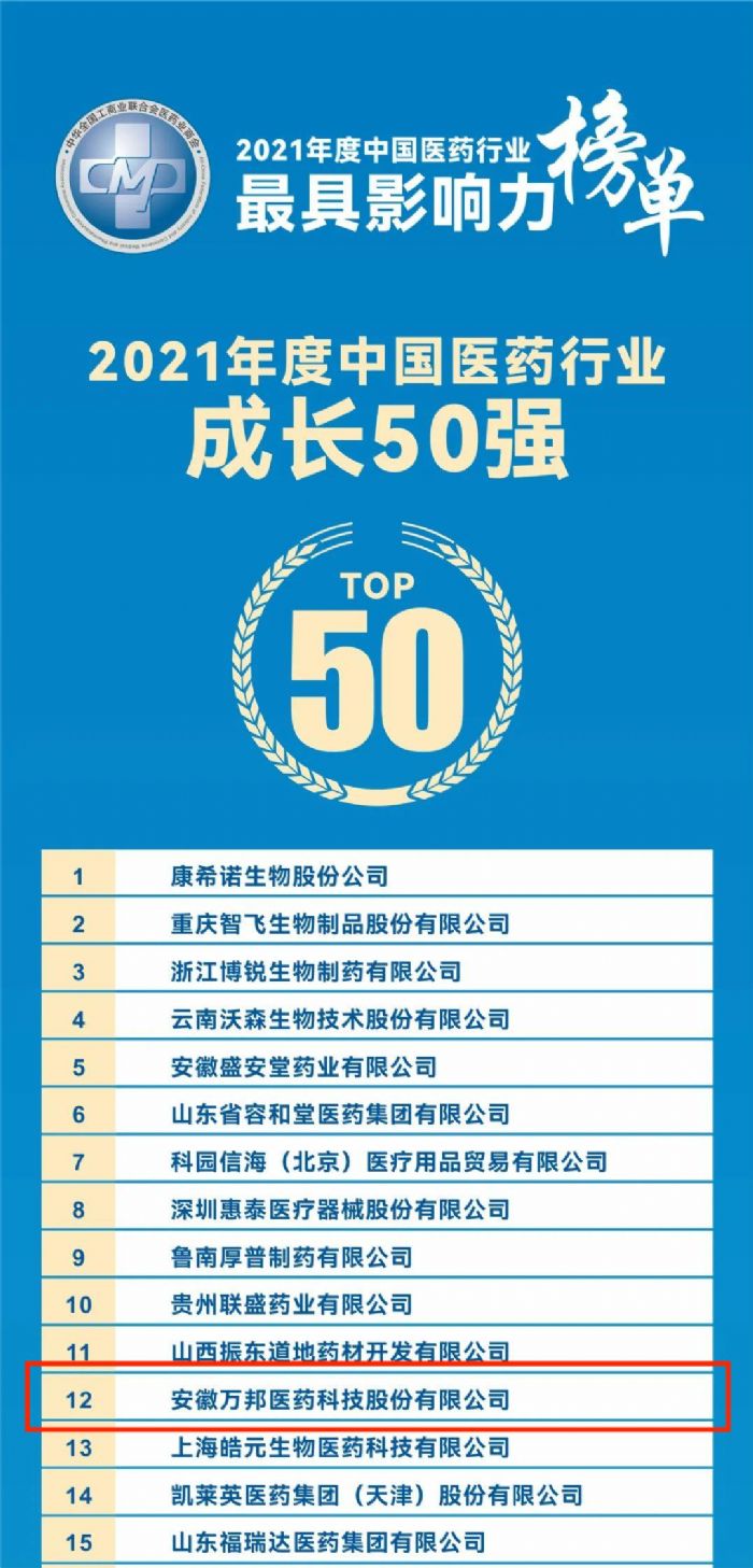 近日,全國工商聯(lián)醫(yī)藥業(yè)商會發(fā)布了2021年度中國醫(yī)藥行業(yè)最具影響力榜單,安徽萬邦醫(yī)藥科技股份有限公司喜獲2021年度“中國醫(yī)藥行業(yè)成長50強(qiáng)”,“中國醫(yī)藥研發(fā)50強(qiáng)”、“中國醫(yī)藥行業(yè)守法誠信企業(yè)”這也是安徽萬邦醫(yī)藥自2017年以來連續(xù)多年獲此殊榮!