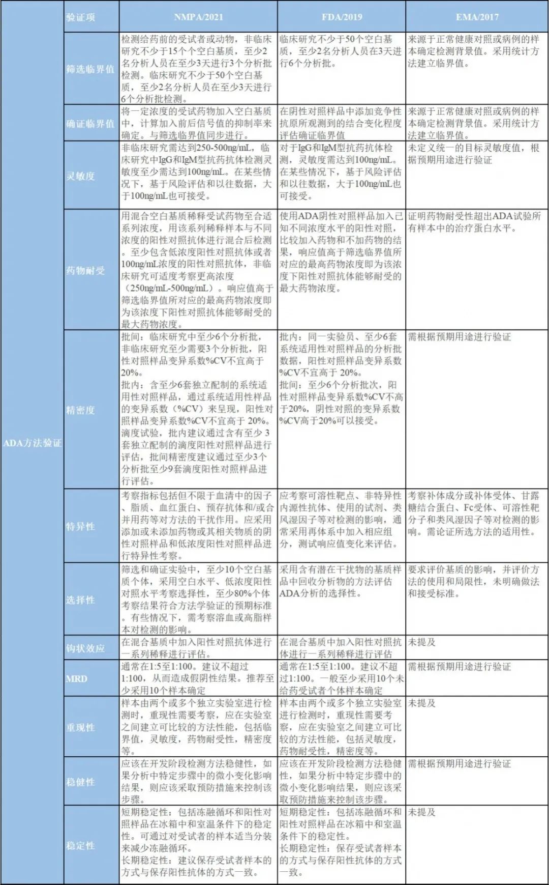國家藥品監(jiān)督管理局(NMPA)于2020年08月24日發(fā)布了《藥物免疫原性研究技術(shù)指導(dǎo)原則(征求意見稿)》,并于2021年03月29日發(fā)布正式版本,其總體的評估策略與FDA相同,與已有的FDA和EMA指導(dǎo)原則有所不同,NMPA正式版則充分考慮到了非臨床和臨床研究中免疫原性檢測方法的差別。這一指導(dǎo)原則的出臺,為國內(nèi)免疫原性相關(guān)研究提供了至關(guān)重要的規(guī)范性指導(dǎo)。