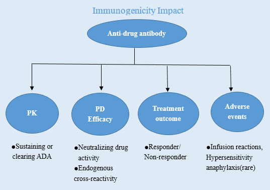 免疫原性(Immunogenicity)是當(dāng)治療類蛋白產(chǎn)品作為某些疾病的治療藥物時,被機(jī)體識別為外來物質(zhì)(抗原)而產(chǎn)生的免疫應(yīng)答。然而對于治療性蛋白的這一免疫應(yīng)答往往是不必要或非預(yù)期的,且在此應(yīng)答過程中可導(dǎo)致機(jī)體產(chǎn)生抗藥抗體(Anti-drug antibodies,ADAs),包括抗藥抗體、中和抗體、免疫復(fù)合物等,ADA的存在可影響藥物的生物學(xué)活性、藥代動力學(xué)參數(shù),甚至使得藥物原有的療效降低或缺失,而當(dāng)有些免疫應(yīng)答與機(jī)體內(nèi)源性蛋白產(chǎn)生交叉免疫反應(yīng),則可能帶來嚴(yán)重的臨床安全問題。