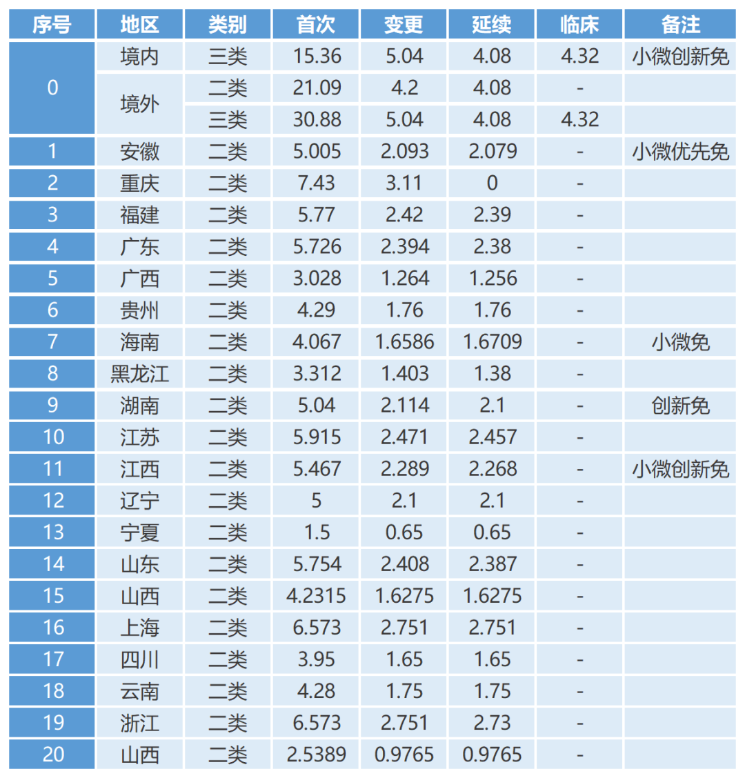 備注:注冊(cè)收費(fèi)單位為萬元。北京、天津、內(nèi)蒙、河北、河南、陜西、湖北、吉林、新疆、西藏、青海注冊(cè)不收費(fèi)。