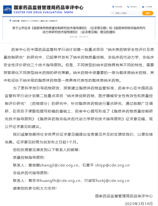 《脂質(zhì)體藥物質(zhì)量控制研究技術(shù)指導(dǎo)原則》(征求意見稿)和《脂質(zhì)體藥物非臨床藥代動(dòng)力學(xué)研究技術(shù)指導(dǎo)原則》(征求意見稿)