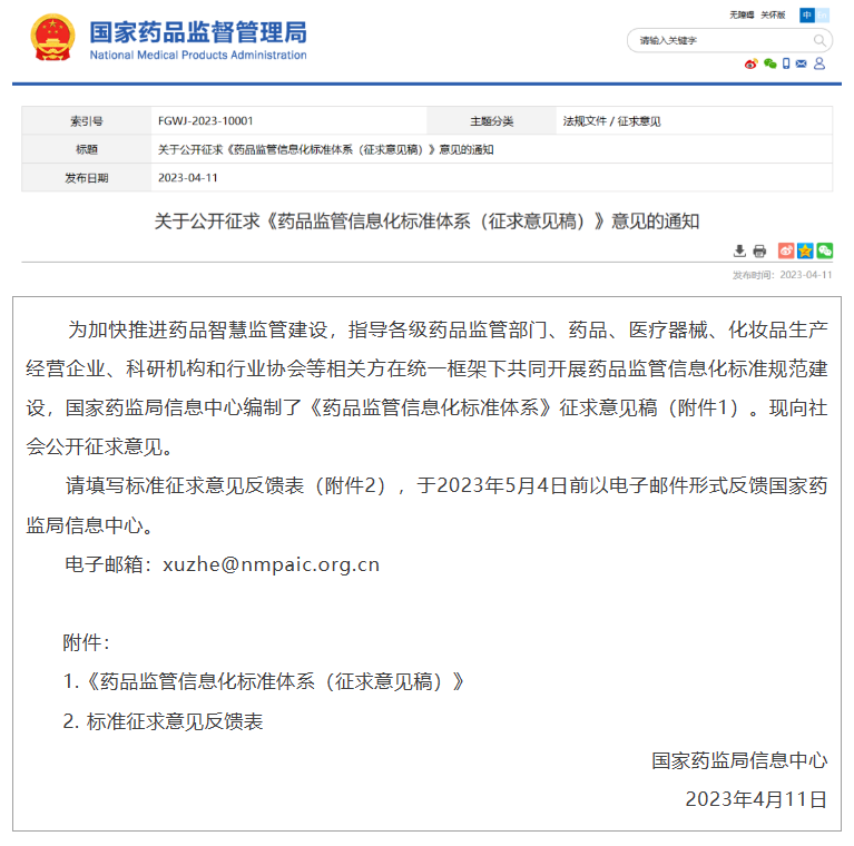 法律法規(guī)|NMPA發(fā)布《藥品監(jiān)管信息化標(biāo)準(zhǔn)體系(征求意見稿)》