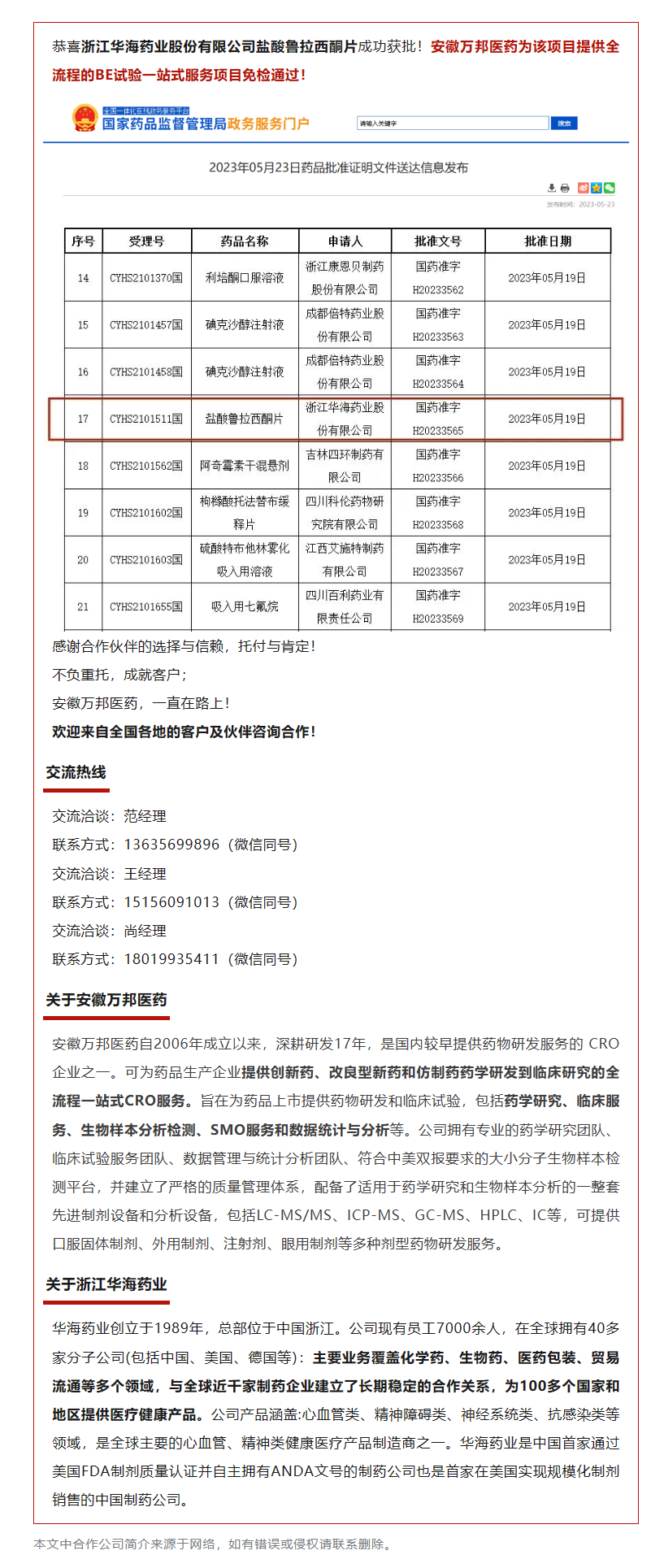 喜報(bào)|安徽萬(wàn)邦醫(yī)藥助力浙江華海鹽酸魯拉西酮片成功獲批